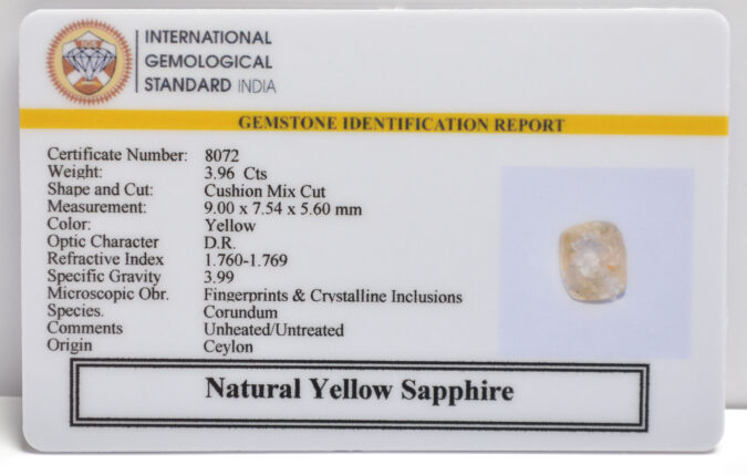 Beautiful 3.96 Cts Natural Yellow Sapphire (AAA-Mines) sva 4+ Ratti YELLOW SAPPHIRE. Free Horoscope & Free Pundit Ji Astrological Advise / Consultation. Original Natural Lab certified gems by IGI GTL / Birth stones / Large Gem Selection of shree shubh Rashi Ratan Vedic dhan at Gem Mines. May Bhagwan Brahma, Vishnu, Shiv & Universe bless you.