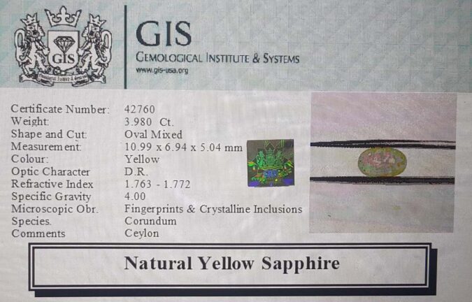 Beautiful 3.98 Ct. Yellow Sapphire (Ceylon(Sri-Lanka) Mines) Sava 4 Ratti Pukhraj. Free Horoscope & Free Pundit Ji Advise / Consultation. Original Natural Lab certified gems by IGI GTL / Birth stones / Large Gem Selection of shree shubh Rashi Ratan Vedic dhan at Gem Mines. May Bhagwan Brahma, Vishnu, Shiv & Universe bless you.