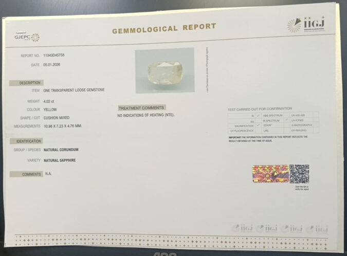 Beautiful 4.02 Cts Natural Yellow Sapphire (AAA+-Mines) sva 4+ Ratti YELLOW SAPPHIRE. Free Horoscope & Free Pundit Ji Astrological Advise / Consultation. Original Natural Lab certified gems by IGI GTL / Birth stones / Large Gem Selection of shree shubh Rashi Ratan Vedic dhan at Gem Mines. May Bhagwan Brahma, Vishnu, Shiv & Universe bless you.