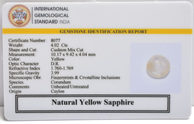 Beautiful 4.02 Cts Natural Yellow Sapphire (AAA-Mines) sva 4+ Ratti YELLOW SAPPHIRE. Free Horoscope & Free Pundit Ji Astrological Advise / Consultation. Original Natural Lab certified gems by IGI GTL / Birth stones / Large Gem Selection of shree shubh Rashi Ratan Vedic dhan at Gem Mines. May Bhagwan Brahma, Vishnu, Shiv & Universe bless you.