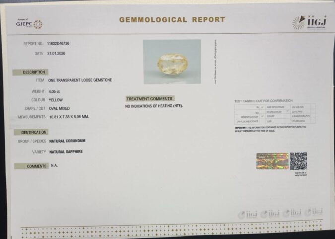 Beautiful 4.05 Cts Natural Yellow Sapphire (AAA+-Mines) sva 4+ Ratti YELLOW SAPPHIRE. Free Horoscope & Free Pundit Ji Astrological Advise / Consultation. Original Natural Lab certified gems by IGI GTL / Birth stones / Large Gem Selection of shree shubh Rashi Ratan Vedic dhan at Gem Mines. May Bhagwan Brahma, Vishnu, Shiv & Universe bless you.