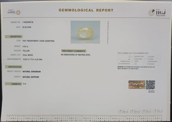 Beautiful 4.05 Cts Natural Yellow Sapphire (Top-Mines) sva 4+ Ratti YELLOW SAPPHIRE. Free Horoscope & Free Pundit Ji Astrological Advise / Consultation. Original Natural Lab certified gems by IGI GTL / Birth stones / Large Gem Selection of shree shubh Rashi Ratan Vedic dhan at Gem Mines. May Bhagwan Brahma, Vishnu, Shiv & Universe bless you.