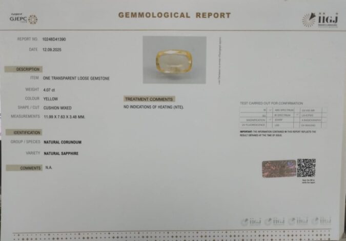Beautiful 4.07 Cts Natural Yellow Sapphire (Top-Mines) sva 4+ Ratti YELLOW SAPPHIRE. Free Horoscope & Free Pundit Ji Astrological Advise / Consultation. Original Natural Lab certified gems by IGI GTL / Birth stones / Large Gem Selection of shree shubh Rashi Ratan Vedic dhan at Gem Mines. May Bhagwan Brahma, Vishnu, Shiv & Universe bless you.