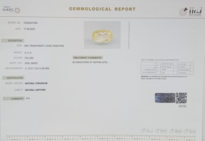 Beautiful 4.11 Cts Natural Yellow Sapphire (AAA+-Mines) sva 4+ Ratti YELLOW SAPPHIRE. Free Horoscope & Free Pundit Ji Astrological Advise / Consultation. Original Natural Lab certified gems by IGI GTL / Birth stones / Large Gem Selection of shree shubh Rashi Ratan Vedic dhan at Gem Mines. May Bhagwan Brahma, Vishnu, Shiv & Universe bless you.