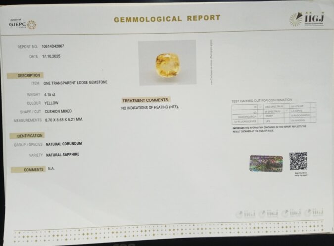 Beautiful 4.15 Cts NATURAL SAPPHIRE (Top-Mines) sva 4+ Ratti YELLOW SAPPHIRE. Free Horoscope & Free Pundit Ji Astrological Advise / Consultation. Original Natural Lab certified gems by IGI GTL / Birth stones / Large Gem Selection of shree shubh Rashi Ratan Vedic dhan at Gem Mines. May Bhagwan Brahma, Vishnu, Shiv & Universe bless you.