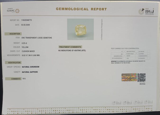 Beautiful 4.25 Cts Natural Yellow Sapphire (Top-Mines) sva 4+ Ratti YELLOW SAPPHIRE. Free Horoscope & Free Pundit Ji Astrological Advise / Consultation. Original Natural Lab certified gems by IGI GTL / Birth stones / Large Gem Selection of shree shubh Rashi Ratan Vedic dhan at Gem Mines. May Bhagwan Brahma, Vishnu, Shiv & Universe bless you.