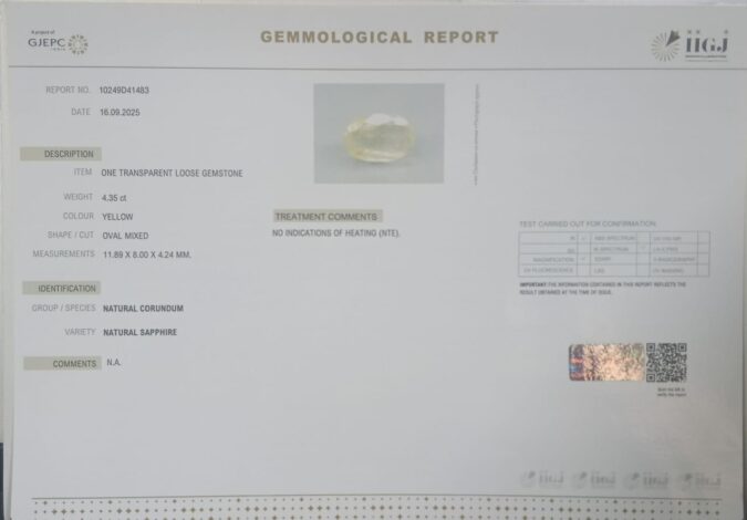 Beautiful 4.35 Cts Natural Yellow Sapphire (Top-Mines) sva 4+ Ratti YELLOW SAPPHIRE. Free Horoscope & Free Pundit Ji Astrological Advise / Consultation. Original Natural Lab certified gems by IGI GTL / Birth stones / Large Gem Selection of shree shubh Rashi Ratan Vedic dhan at Gem Mines. May Bhagwan Brahma, Vishnu, Shiv & Universe bless you.