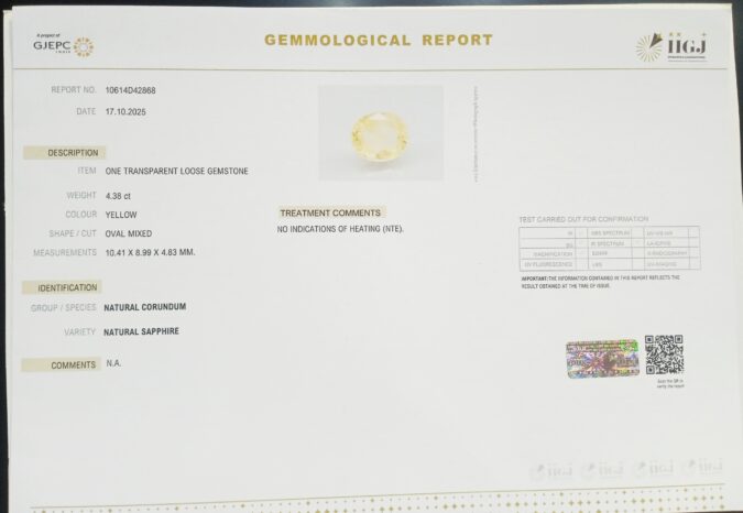 Beautiful 4.38 Cts NATURAL SAPPHIRE (AAA+-Mines) sva 4+ Ratti YELLOW SAPPHIRE. Free Horoscope & Free Pundit Ji Astrological Advise / Consultation. Original Natural Lab certified gems by IGI GTL / Birth stones / Large Gem Selection of shree shubh Rashi Ratan Vedic dhan at Gem Mines. May Bhagwan Brahma, Vishnu, Shiv & Universe bless you.