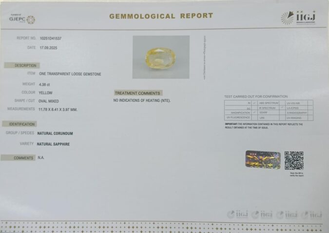 Beautiful 4.38 Cts Natural Yellow Sapphire (Top+-Mines) sva 4+ Ratti YELLOW SAPPHIRE. Free Horoscope & Free Pundit Ji Astrological Advise / Consultation. Original Natural Lab certified gems by IGI GTL / Birth stones / Large Gem Selection of shree shubh Rashi Ratan Vedic dhan at Gem Mines. May Bhagwan Brahma, Vishnu, Shiv & Universe bless you.