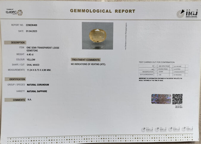 Beautiful 4.4 Ct. Natural Yellow Sapphire (AAA-Mines) sva 4+ Ratti Pukhraj. Free Horoscope & Free Pundit Ji Astrological Advise / Consultation. Original Natural Lab certified gems by IGI GTL / Birth stones / Large Gem Selection of shree shubh Rashi Ratan Vedic dhan at Gem Mines. May Bhagwan Brahma, Vishnu, Shiv & Universe bless you.