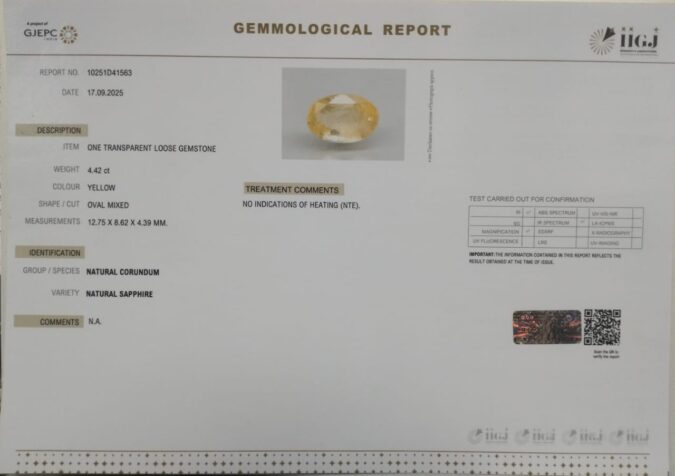 Beautiful 4.42 Cts Natural Yellow Sapphire (Top-Mines) sva 4+ Ratti YELLOW SAPPHIRE. Free Horoscope & Free Pundit Ji Astrological Advise / Consultation. Original Natural Lab certified gems by IGI GTL / Birth stones / Large Gem Selection of shree shubh Rashi Ratan Vedic dhan at Gem Mines. May Bhagwan Brahma, Vishnu, Shiv & Universe bless you.