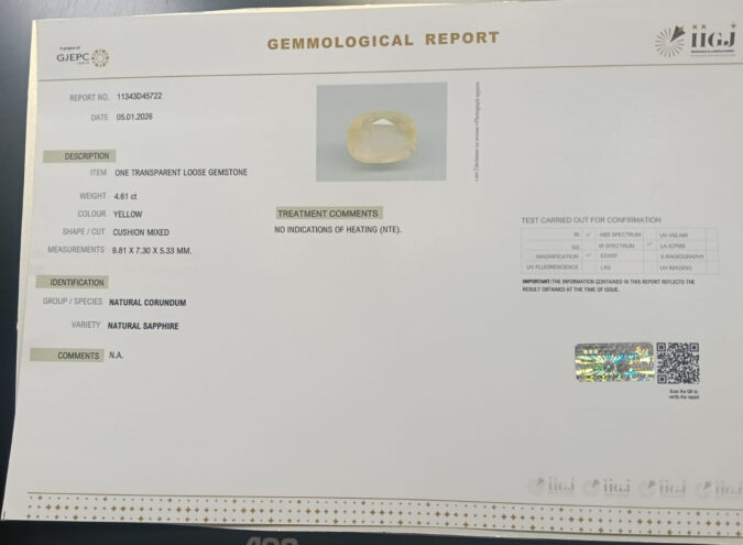 Beautiful 4.61 Cts Natural Yellow Sapphire (AAA+-Mines) sva 5+ Ratti YELLOW SAPPHIRE. Free Horoscope & Free Pundit Ji Astrological Advise / Consultation. Original Natural Lab certified gems by IGI GTL / Birth stones / Large Gem Selection of shree shubh Rashi Ratan Vedic dhan at Gem Mines. May Bhagwan Brahma, Vishnu, Shiv & Universe bless you.