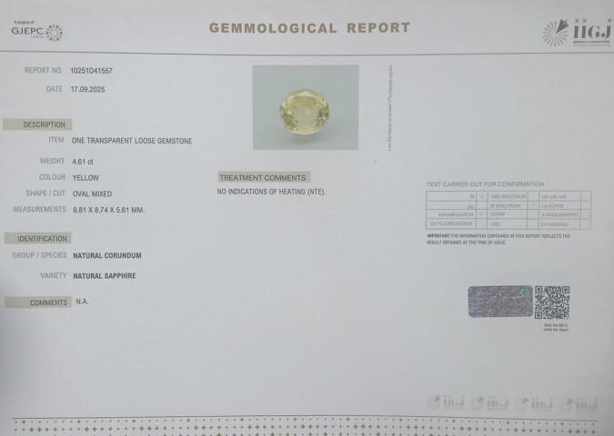 Beautiful 4.61 Cts Natural Yellow Sapphire (Top++-Mines) sva 5+ Ratti YELLOW SAPPHIRE. Free Horoscope & Free Pundit Ji Astrological Advise / Consultation. Original Natural Lab certified gems by IGI GTL / Birth stones / Large Gem Selection of shree shubh Rashi Ratan Vedic dhan at Gem Mines. May Bhagwan Brahma, Vishnu, Shiv & Universe bless you.