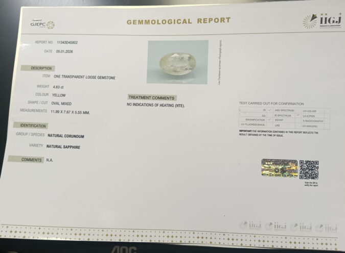 Beautiful 4.63 Cts Natural Yellow Sapphire (AAA+-Mines) sva 5+ Ratti YELLOW SAPPHIRE. Free Horoscope & Free Pundit Ji Astrological Advise / Consultation. Original Natural Lab certified gems by IGI GTL / Birth stones / Large Gem Selection of shree shubh Rashi Ratan Vedic dhan at Gem Mines. May Bhagwan Brahma, Vishnu, Shiv & Universe bless you.