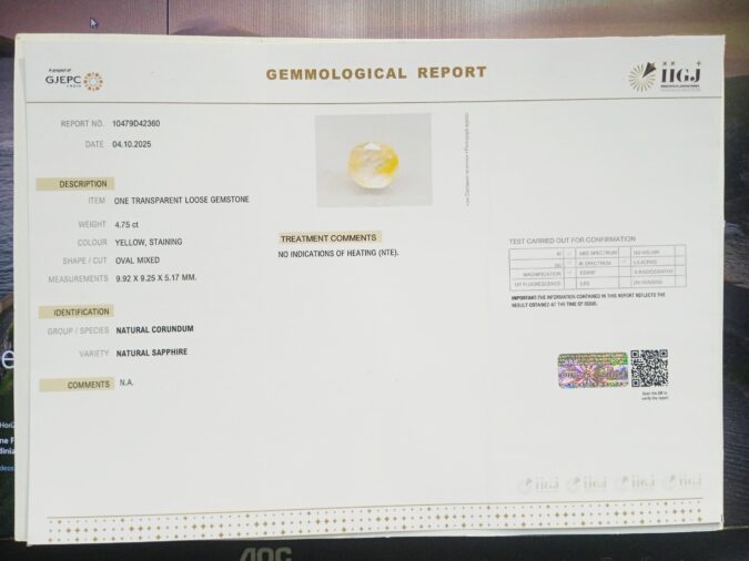 Beautiful 4.75 Cts NATURAL SAPPHIRE (AAA+-Mines) sva 5+ Ratti YELLOW SAPPHIRE. Free Horoscope & Free Pundit Ji Astrological Advise / Consultation. Original Natural Lab certified gems by IGI GTL / Birth stones / Large Gem Selection of shree shubh Rashi Ratan Vedic dhan at Gem Mines. May Bhagwan Brahma, Vishnu, Shiv & Universe bless you.