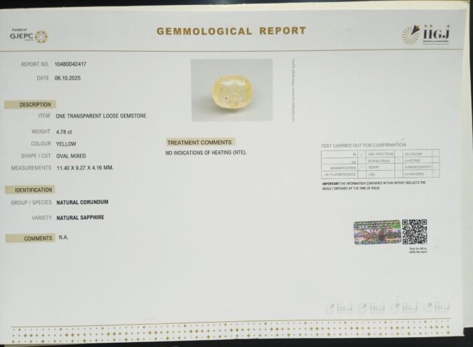 Beautiful 4.78 Cts NATURAL SAPPHIRE (Good-Mines) sva 5+ Ratti YELLOW SAPPHIRE. Free Horoscope & Free Pundit Ji Astrological Advise / Consultation. Original Natural Lab certified gems by IGI GTL / Birth stones / Large Gem Selection of shree shubh Rashi Ratan Vedic dhan at Gem Mines. May Bhagwan Brahma, Vishnu, Shiv & Universe bless you.