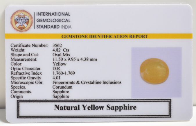 Beautiful 4.82 Cts Natural Yellow Sapphire (AAA-Mines) sva 5+ Ratti YELLOW SAPPHIRE. Free Horoscope & Free Pundit Ji Astrological Advise / Consultation. Original Natural Lab certified gems by IGI GTL / Birth stones / Large Gem Selection of shree shubh Rashi Ratan Vedic dhan at Gem Mines. May Bhagwan Brahma, Vishnu, Shiv & Universe bless you.