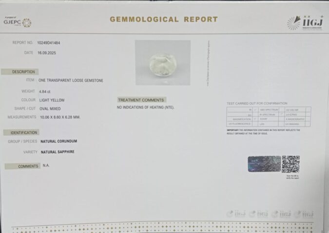 Beautiful 4.84 Cts Natural Yellow Sapphire (AAA+-Mines) sva 5+ Ratti YELLOW SAPPHIRE. Free Horoscope & Free Pundit Ji Astrological Advise / Consultation. Original Natural Lab certified gems by IGI GTL / Birth stones / Large Gem Selection of shree shubh Rashi Ratan Vedic dhan at Gem Mines. May Bhagwan Brahma, Vishnu, Shiv & Universe bless you.