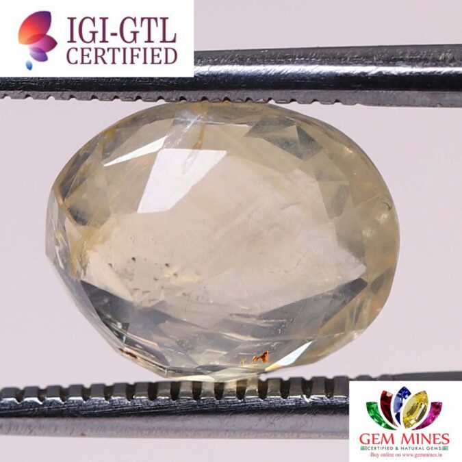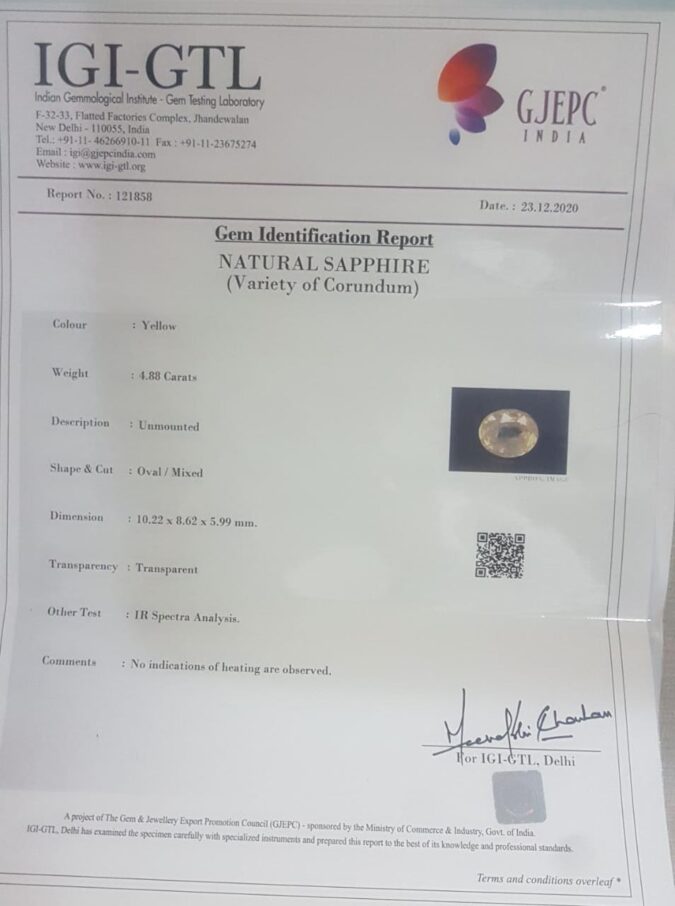 Beautiful 4.88 Ct. Yellow Sapphire (Ceylon Sri Lanka Mines) Sava 5 Ratti Pukhraj. Free Horoscope & Free Pundit Ji Advise / Consultation. Original Natural Lab certified gems by IGI GTL / Birth stones / Large Gem Selection of shree shubh Rashi Ratan Vedic dhan at Gem Mines. May Bhagwan Brahma, Vishnu, Shiv & Universe bless you.