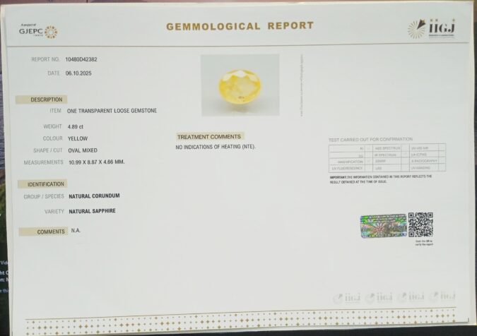 Beautiful 4.89 Cts NATURAL SAPPHIRE (Good-Mines) sva 5+ Ratti YELLOW SAPPHIRE. Free Horoscope & Free Pundit Ji Astrological Advise / Consultation. Original Natural Lab certified gems by IGI GTL / Birth stones / Large Gem Selection of shree shubh Rashi Ratan Vedic dhan at Gem Mines. May Bhagwan Brahma, Vishnu, Shiv & Universe bless you.