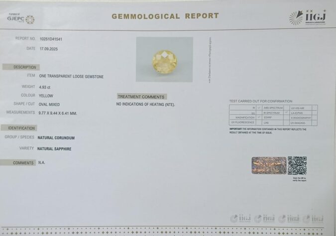Beautiful 4.93 Cts Natural Yellow Sapphire (Top-Mines) sva 5+ Ratti YELLOW SAPPHIRE. Free Horoscope & Free Pundit Ji Astrological Advise / Consultation. Original Natural Lab certified gems by IGI GTL / Birth stones / Large Gem Selection of shree shubh Rashi Ratan Vedic dhan at Gem Mines. May Bhagwan Brahma, Vishnu, Shiv & Universe bless you.