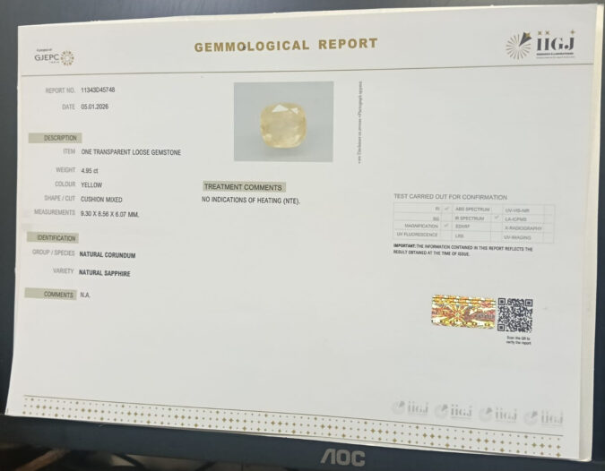 Beautiful 4.95 Cts Natural Yellow Sapphire (AAA+-Mines) sva 5+ Ratti YELLOW SAPPHIRE. Free Horoscope & Free Pundit Ji Astrological Advise / Consultation. Original Natural Lab certified gems by IGI GTL / Birth stones / Large Gem Selection of shree shubh Rashi Ratan Vedic dhan at Gem Mines. May Bhagwan Brahma, Vishnu, Shiv & Universe bless you.