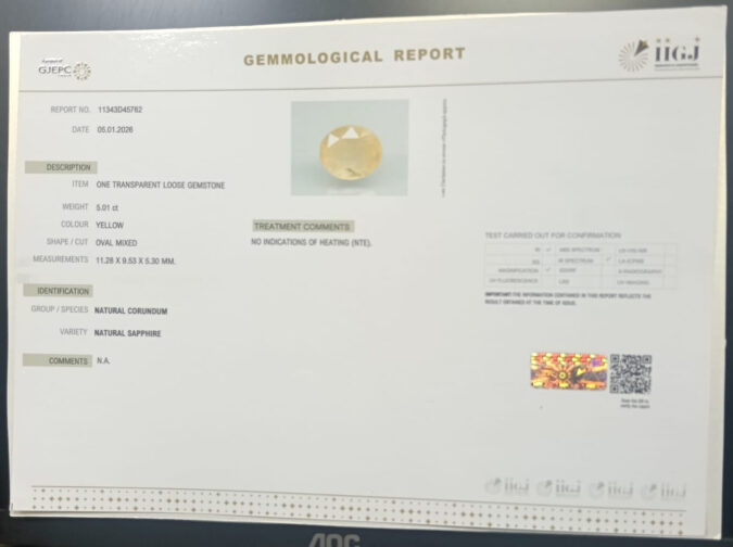 Beautiful 5.01 Cts Natural Yellow Sapphire (AAA+-Mines) sva 5+ Ratti YELLOW SAPPHIRE. Free Horoscope & Free Pundit Ji Astrological Advise / Consultation. Original Natural Lab certified gems by IGI GTL / Birth stones / Large Gem Selection of shree shubh Rashi Ratan Vedic dhan at Gem Mines. May Bhagwan Brahma, Vishnu, Shiv & Universe bless you.