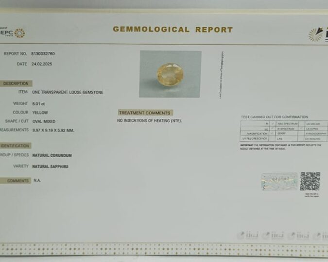 Beautiful 5.01 Ct. Natural Yellow Sapphire (Top Mines) sva 5+ Ratti Pukhraj. Free Horoscope & Free Pundit Ji Astrological Advise / Consultation. Original Natural Lab certified gems by IGI GTL / Birth stones / Large Gem Selection of shree shubh Rashi Ratan Vedic dhan at Gem Mines. May Bhagwan Brahma, Vishnu, Shiv & Universe bless you.
