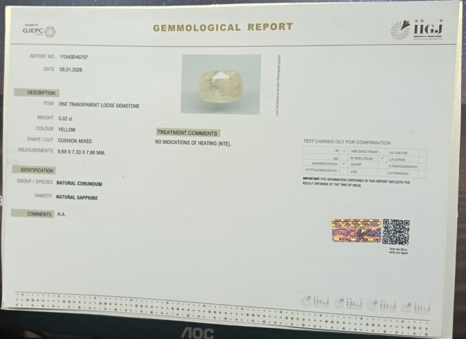 Beautiful 5.02 Cts Natural Yellow Sapphire (AAA+-Mines) sva 5+ Ratti YELLOW SAPPHIRE. Free Horoscope & Free Pundit Ji Astrological Advise / Consultation. Original Natural Lab certified gems by IGI GTL / Birth stones / Large Gem Selection of shree shubh Rashi Ratan Vedic dhan at Gem Mines. May Bhagwan Brahma, Vishnu, Shiv & Universe bless you.
