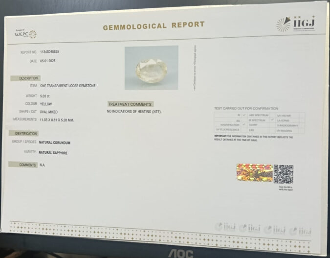 Beautiful 5.03 Cts Natural Yellow Sapphire (AAA+-Mines) sva 5+ Ratti YELLOW SAPPHIRE. Free Horoscope & Free Pundit Ji Astrological Advise / Consultation. Original Natural Lab certified gems by IGI GTL / Birth stones / Large Gem Selection of shree shubh Rashi Ratan Vedic dhan at Gem Mines. May Bhagwan Brahma, Vishnu, Shiv & Universe bless you.