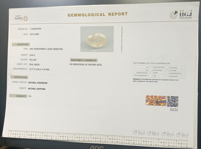 Beautiful 5.4 Cts Natural Yellow Sapphire (AAA+-Mines) sva 6+ Ratti YELLOW SAPPHIRE. Free Horoscope & Free Pundit Ji Astrological Advise / Consultation. Original Natural Lab certified gems by IGI GTL / Birth stones / Large Gem Selection of shree shubh Rashi Ratan Vedic dhan at Gem Mines. May Bhagwan Brahma, Vishnu, Shiv & Universe bless you.