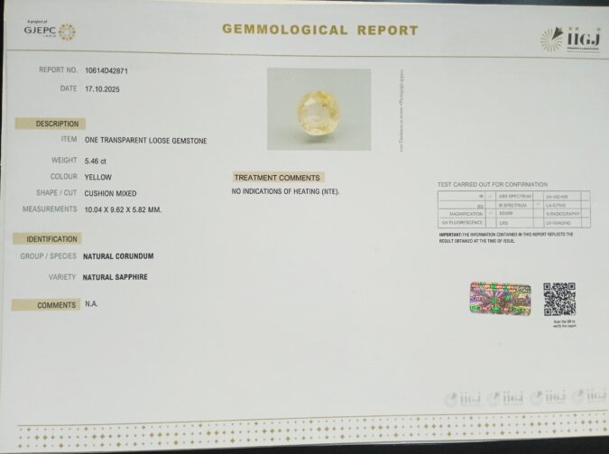 Beautiful 5.46 Cts NATURAL SAPPHIRE (AAA+-Mines) sva 6+ Ratti YELLOW SAPPHIRE. Free Horoscope & Free Pundit Ji Astrological Advise / Consultation. Original Natural Lab certified gems by IGI GTL / Birth stones / Large Gem Selection of shree shubh Rashi Ratan Vedic dhan at Gem Mines. May Bhagwan Brahma, Vishnu, Shiv & Universe bless you.