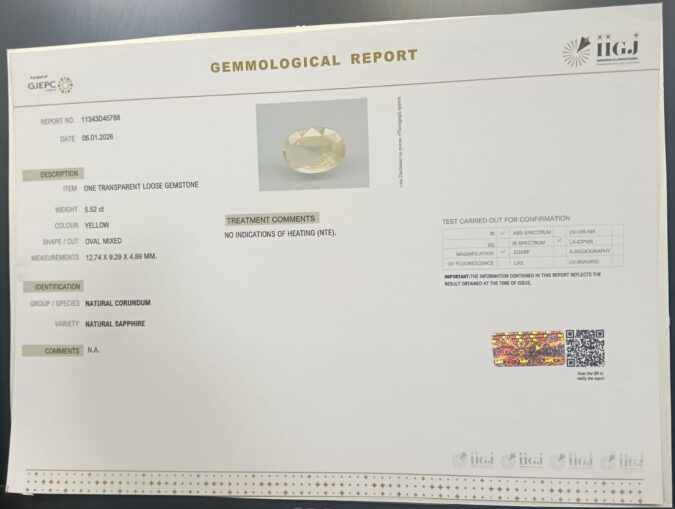 Beautiful 5.52 Cts Natural Yellow Sapphire (AAA+-Mines) sva 6+ Ratti YELLOW SAPPHIRE. Free Horoscope & Free Pundit Ji Astrological Advise / Consultation. Original Natural Lab certified gems by IGI GTL / Birth stones / Large Gem Selection of shree shubh Rashi Ratan Vedic dhan at Gem Mines. May Bhagwan Brahma, Vishnu, Shiv & Universe bless you.