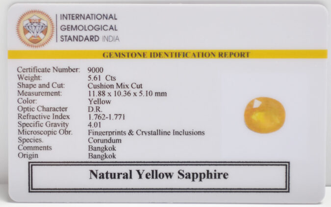 Beautiful 5.61 Cts Natural Yellow Sapphire (Good-Mines) sva 6+ Ratti YELLOW SAPPHIRE. Free Horoscope & Free Pundit Ji Astrological Advise / Consultation. Original Natural Lab certified gems by IGI GTL / Birth stones / Large Gem Selection of shree shubh Rashi Ratan Vedic dhan at Gem Mines. May Bhagwan Brahma, Vishnu, Shiv & Universe bless you.