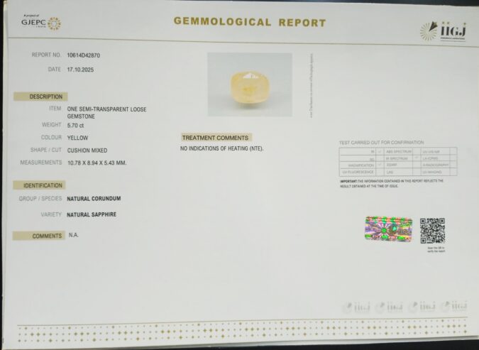 Beautiful 5.7 Cts NATURAL SAPPHIRE (Very Good-Mines) sva 6+ Ratti YELLOW SAPPHIRE. Free Horoscope & Free Pundit Ji Astrological Advise / Consultation. Original Natural Lab certified gems by IGI GTL / Birth stones / Large Gem Selection of shree shubh Rashi Ratan Vedic dhan at Gem Mines. May Bhagwan Brahma, Vishnu, Shiv & Universe bless you.