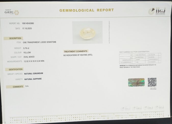 Beautiful 5.79 Cts NATURAL SAPPHIRE (Very Good-Mines) sva 6+ Ratti YELLOW SAPPHIRE. Free Horoscope & Free Pundit Ji Astrological Advise / Consultation. Original Natural Lab certified gems by IGI GTL / Birth stones / Large Gem Selection of shree shubh Rashi Ratan Vedic dhan at Gem Mines. May Bhagwan Brahma, Vishnu, Shiv & Universe bless you.