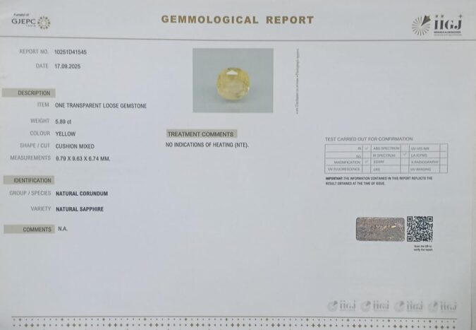 Beautiful 5.89 Cts Natural Yellow Sapphire (Top-Mines) sva 6+ Ratti YELLOW SAPPHIRE. Free Horoscope & Free Pundit Ji Astrological Advise / Consultation. Original Natural Lab certified gems by IGI GTL / Birth stones / Large Gem Selection of shree shubh Rashi Ratan Vedic dhan at Gem Mines. May Bhagwan Brahma, Vishnu, Shiv & Universe bless you.
