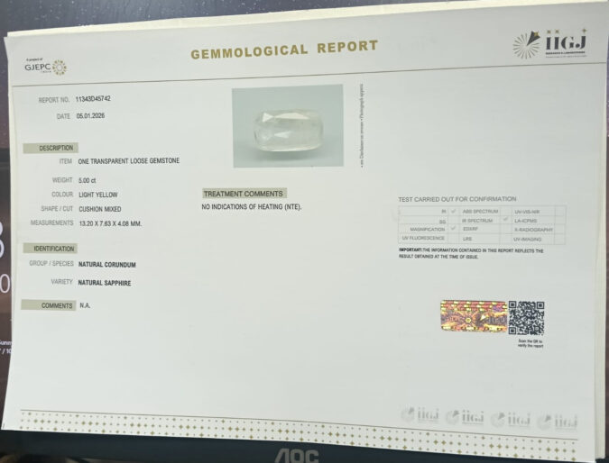Beautiful 5 Cts Natural Yellow Sapphire (AAA+-Mines) sva 5+ Ratti YELLOW SAPPHIRE. Free Horoscope & Free Pundit Ji Astrological Advise / Consultation. Original Natural Lab certified gems by IGI GTL / Birth stones / Large Gem Selection of shree shubh Rashi Ratan Vedic dhan at Gem Mines. May Bhagwan Brahma, Vishnu, Shiv & Universe bless you.