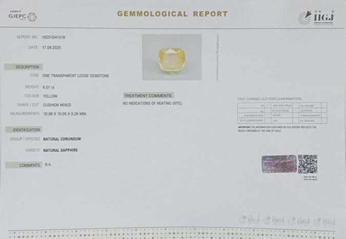 Beautiful 6.07 Cts Natural Yellow Sapphire (Top-Mines) sva 6+ Ratti YELLOW SAPPHIRE. Free Horoscope & Free Pundit Ji Astrological Advise / Consultation. Original Natural Lab certified gems by IGI GTL / Birth stones / Large Gem Selection of shree shubh Rashi Ratan Vedic dhan at Gem Mines. May Bhagwan Brahma, Vishnu, Shiv & Universe bless you.