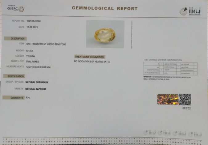 Beautiful 6.12 Cts Natural Yellow Sapphire (Top++-Mines) sva 6+ Ratti YELLOW SAPPHIRE. Free Horoscope & Free Pundit Ji Astrological Advise / Consultation. Original Natural Lab certified gems by IGI GTL / Birth stones / Large Gem Selection of shree shubh Rashi Ratan Vedic dhan at Gem Mines. May Bhagwan Brahma, Vishnu, Shiv & Universe bless you.