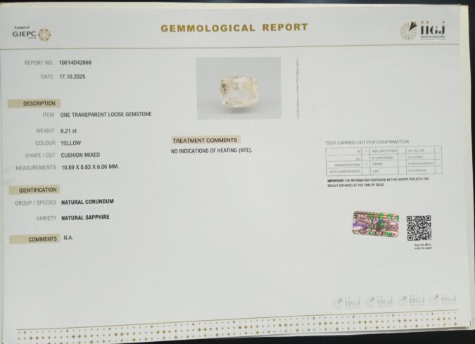 Beautiful 6.21 Cts NATURAL SAPPHIRE (AAA+-Mines) sva 6+ Ratti YELLOW SAPPHIRE. Free Horoscope & Free Pundit Ji Astrological Advise / Consultation. Original Natural Lab certified gems by IGI GTL / Birth stones / Large Gem Selection of shree shubh Rashi Ratan Vedic dhan at Gem Mines. May Bhagwan Brahma, Vishnu, Shiv & Universe bless you.