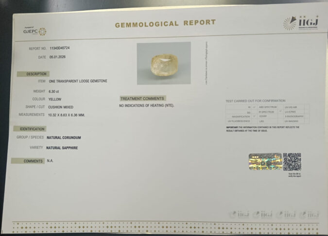 Beautiful 6.3 Cts Natural Yellow Sapphire (AAA+-Mines) sva 7+ Ratti YELLOW SAPPHIRE. Free Horoscope & Free Pundit Ji Astrological Advise / Consultation. Original Natural Lab certified gems by IGI GTL / Birth stones / Large Gem Selection of shree shubh Rashi Ratan Vedic dhan at Gem Mines. May Bhagwan Brahma, Vishnu, Shiv & Universe bless you.