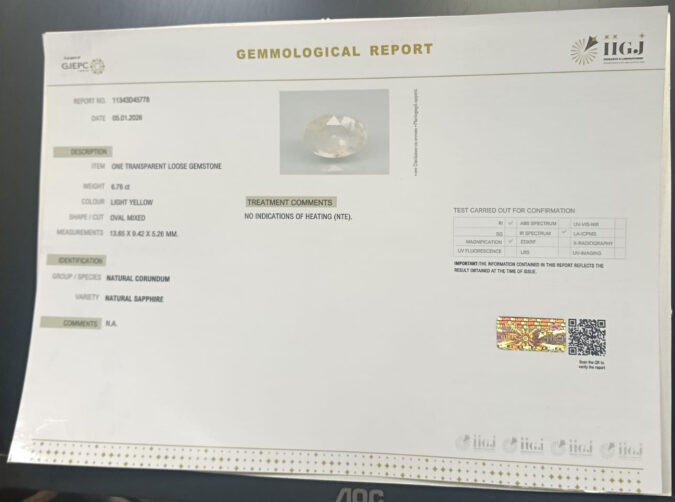 Beautiful 6.76 Cts Natural Yellow Sapphire (AAA+-Mines) sva 7+ Ratti YELLOW SAPPHIRE. Free Horoscope & Free Pundit Ji Astrological Advise / Consultation. Original Natural Lab certified gems by IGI GTL / Birth stones / Large Gem Selection of shree shubh Rashi Ratan Vedic dhan at Gem Mines. May Bhagwan Brahma, Vishnu, Shiv & Universe bless you.