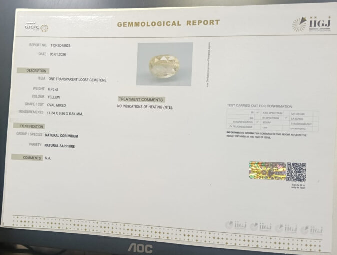 Beautiful 6.78 Cts Natural Yellow Sapphire (AAA+-Mines) sva 7+ Ratti YELLOW SAPPHIRE. Free Horoscope & Free Pundit Ji Astrological Advise / Consultation. Original Natural Lab certified gems by IGI GTL / Birth stones / Large Gem Selection of shree shubh Rashi Ratan Vedic dhan at Gem Mines. May Bhagwan Brahma, Vishnu, Shiv & Universe bless you.