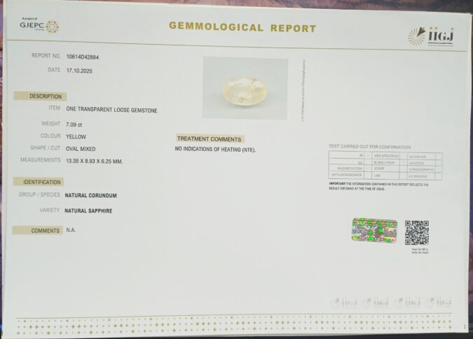 Beautiful 7.09 Cts NATURAL SAPPHIRE (AAA-Mines) sva 7+ Ratti YELLOW SAPPHIRE. Free Horoscope & Free Pundit Ji Astrological Advise / Consultation. Original Natural Lab certified gems by IGI GTL / Birth stones / Large Gem Selection of shree shubh Rashi Ratan Vedic dhan at Gem Mines. May Bhagwan Brahma, Vishnu, Shiv & Universe bless you.