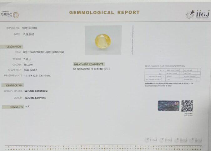 Beautiful 7.58 Cts Natural Yellow Sapphire (Top-Mines) sva 8+ Ratti YELLOW SAPPHIRE. Free Horoscope & Free Pundit Ji Astrological Advise / Consultation. Original Natural Lab certified gems by IGI GTL / Birth stones / Large Gem Selection of shree shubh Rashi Ratan Vedic dhan at Gem Mines. May Bhagwan Brahma, Vishnu, Shiv & Universe bless you.